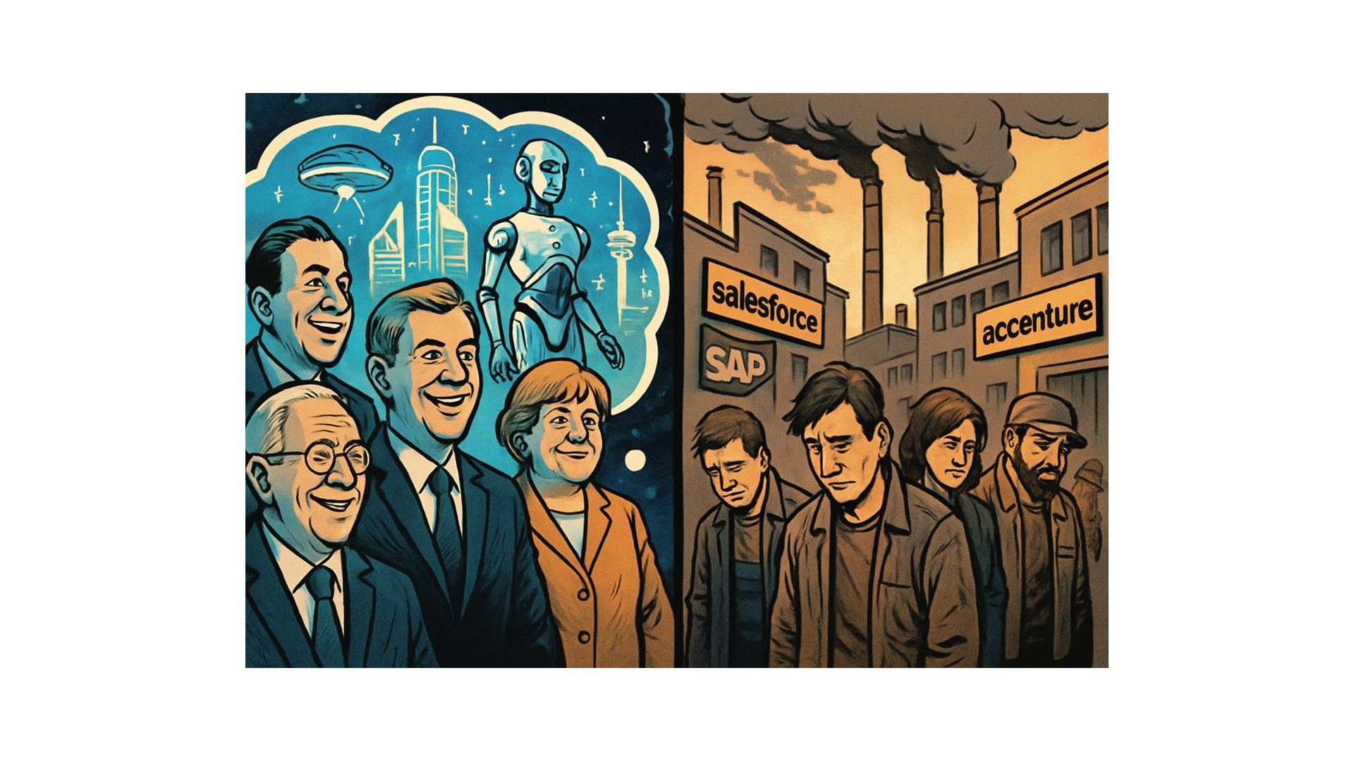 Während die Poli­tik von deutschen Foun­da­tion Mod­els und KI-Lead­er­ship träumt, ent­lassen Sales­force, SAP und Accen­ture bere­its Tausende von Mitar­beit­ern. Eine kri­tis­che Analyse der Kluft zwis­chen poli­tis­chen Zukun­ftsvi­sio­nen und wirtschaftlich­er Real­ität in Zeit­en der gen­er­a­tiv­en KI-Rev­o­lu­tion.